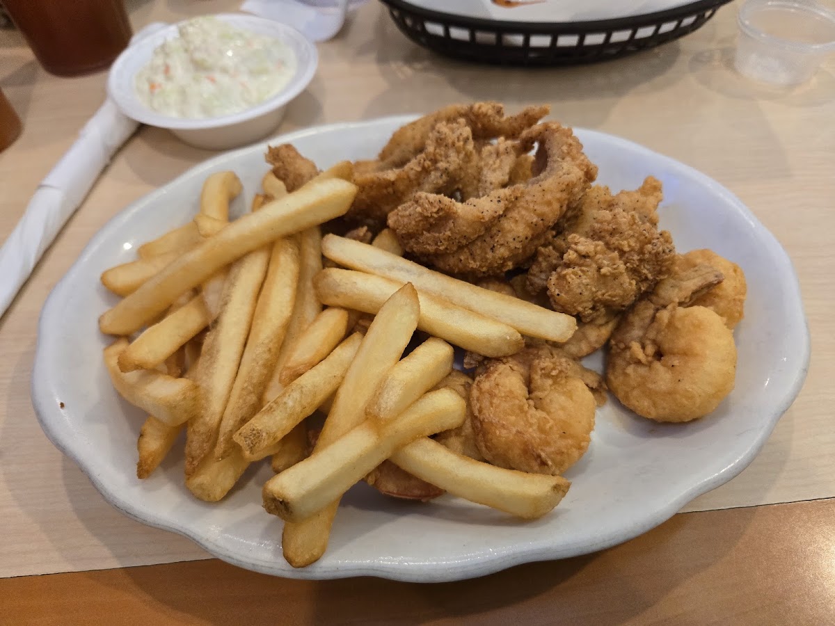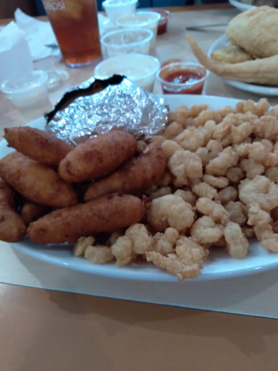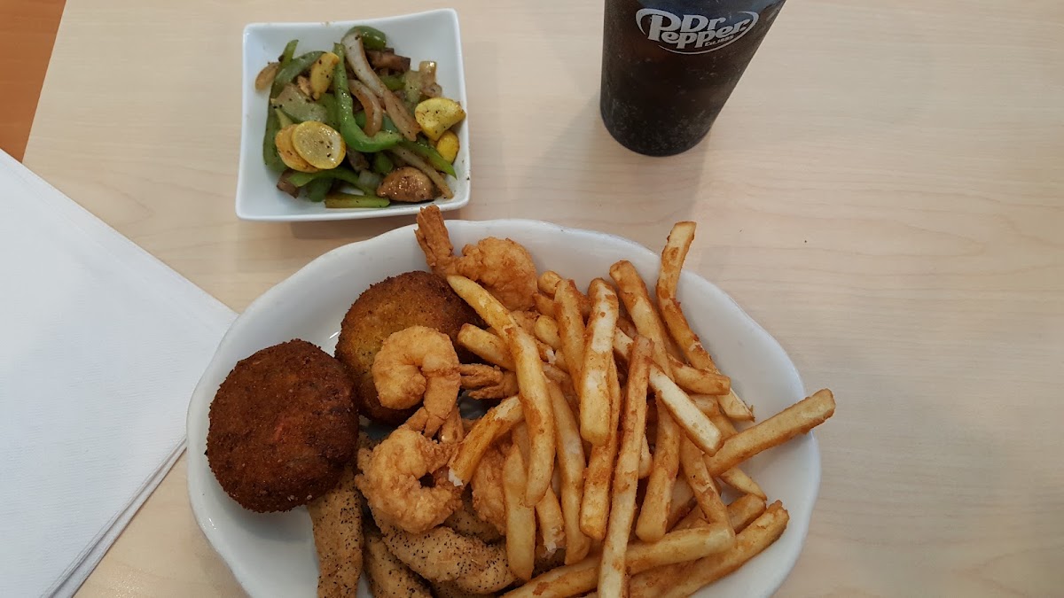 Well the truth is I was visiting my mother while she was under care,,she recommended the place ,,that I honestly didn't know existed,,so I went to place a order to go,,the staff and the host of the counter,,were extremely nice and educated me a little of the restaurant it's self,,I ordered 2 combination plates with baby flounder, fried oysters, and popcorn shrimp,,I was told 15 minutes,,I had it in ten,,it was all cooked perfectly and tasted excellent and all was hot,,potato wedges for a side they were good as well,,when I visit my mother again I will definitely be going back,,,I recommend everyone give it a try,,,that's all