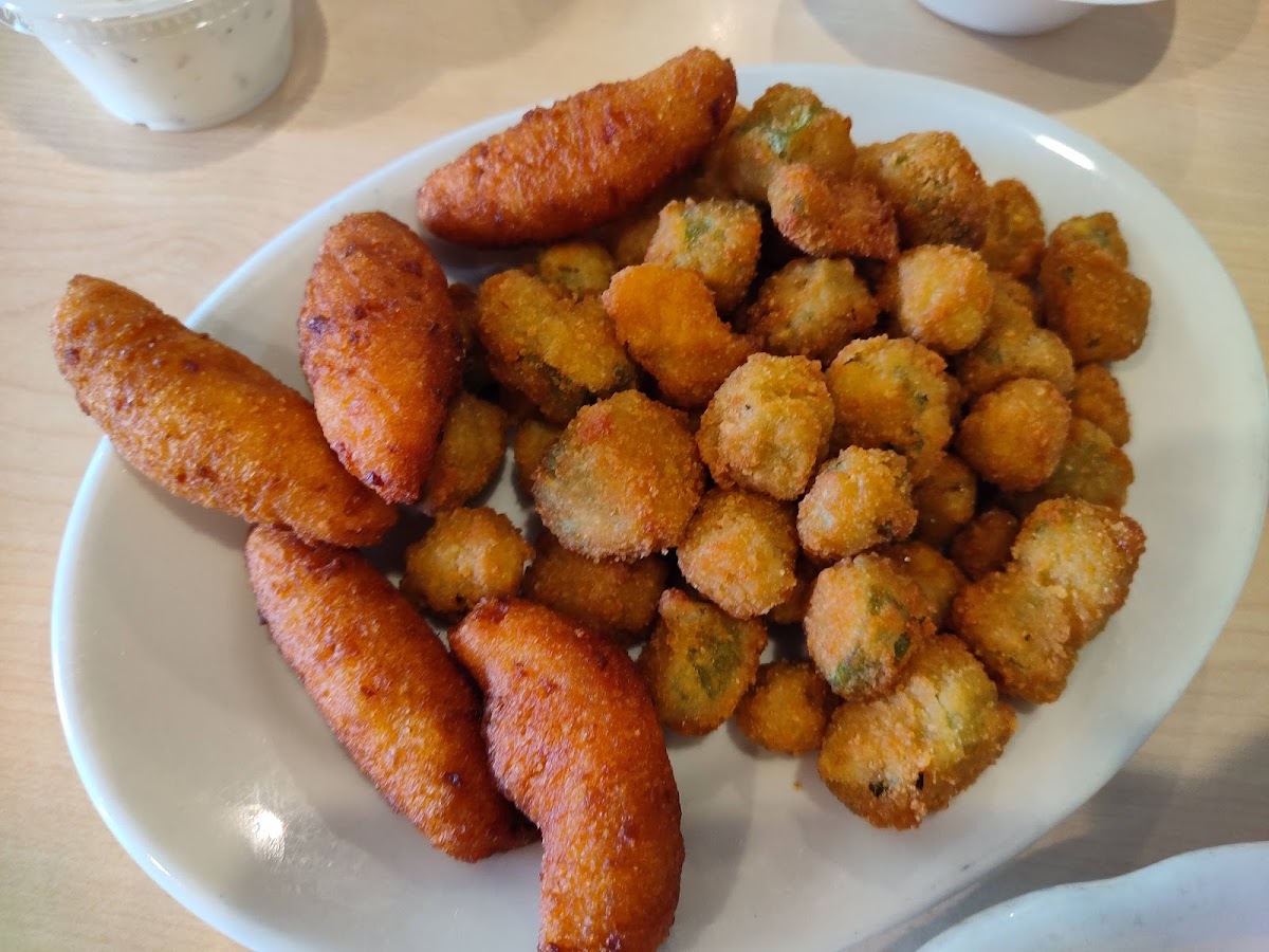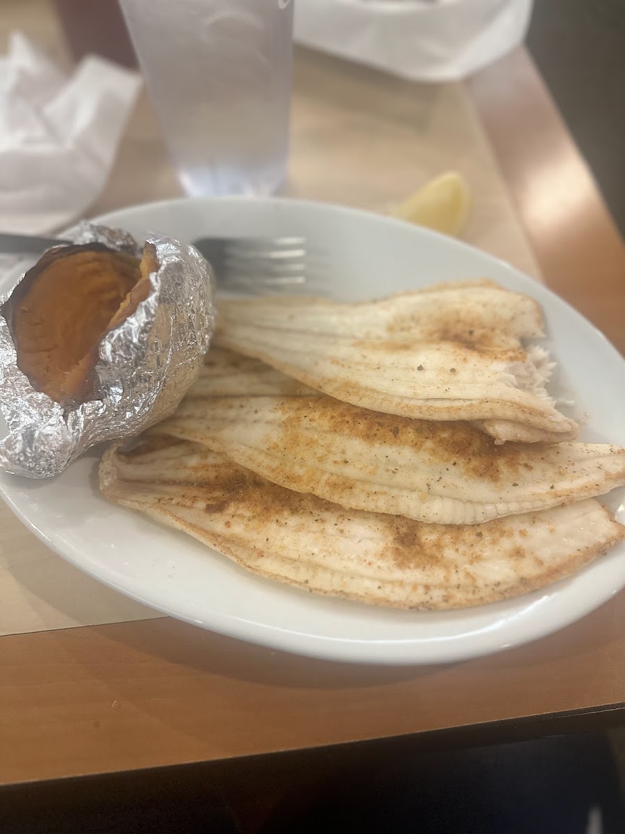 Large baby flounder with potatoe wedges and fried okra. The hostess/cashier who took my order over the phone was kind and patient. The food was well prepared and fresh. I prefer a little more seasoning, nothing to complain about.(I'm just picky.) Will return.
